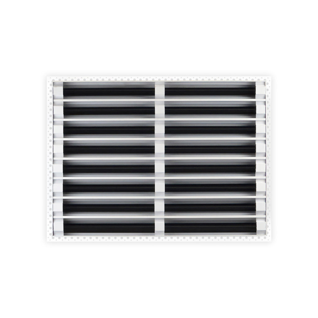 • Texas Buildmart offers Mud In Air Vent Covers also known as Drywall Mud-in White Air Vents. This Mud In Air Vent Cover shoots a 90-degree spread with option to adjust to one side or the other. These have decorative directional dampers. Modern, crisp, clean lines and architecturally appealing. Solid extruded aluminum profile, expertly welded, grinded, and sanded, with reinforcement brackets on the back and a uniform coat of electrostatic paint for a sleek, modern finish and easy maintenance. This white air vent register can be used as a supply air vent cover for ceilings and walls and as a return air vent cover register but looks like a Luxury Drywall Mud-in Vent Cover. If our Mud In Air Vent Cover is used as a Return air vent cover, please make sure the air vent cover is placed in the full open position or remove the directional dampers. Update your Ceiling and Wall Vents with our Mud In Air Vent Covers and it will update the entire look of your Home or Office Space. Rejillas para aire acondicionado de casa blanco. We make all sizes from 6x4 to 30x24 Modern Mud Air Vent Covers for the Modern Day Home. *This is a Design and Utility Patent Pending Product*