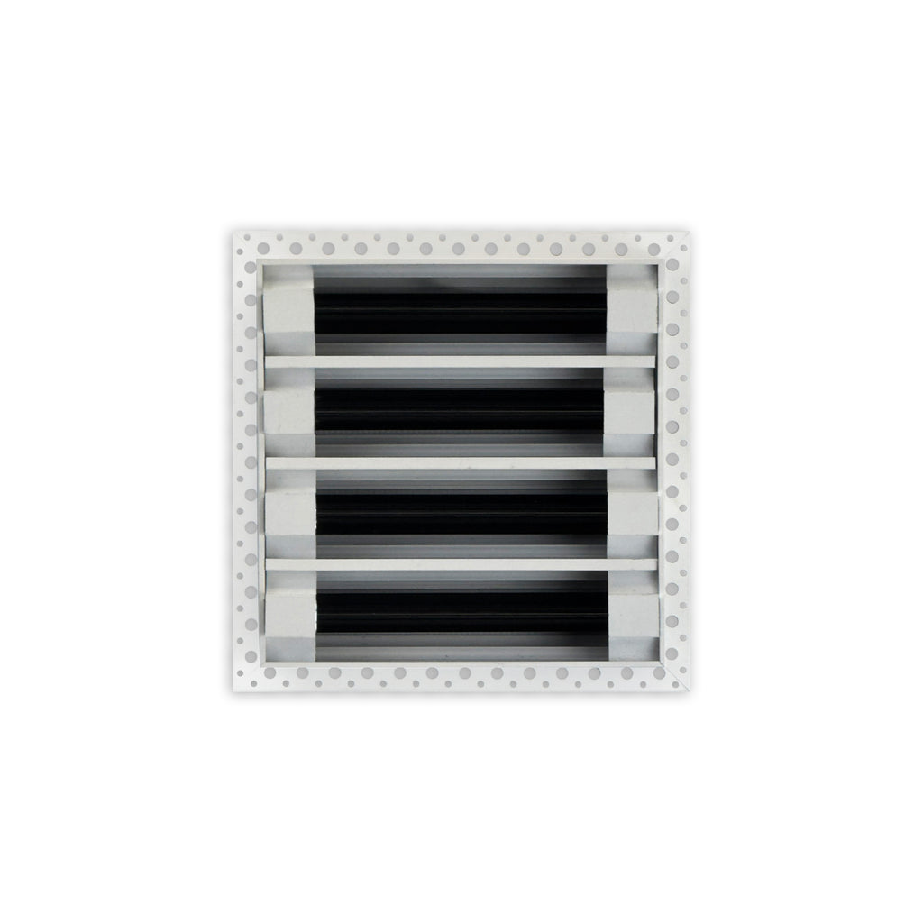 • Texas Buildmart offers Mud In Air Vent Covers also known as Drywall Mud-in White Air Vents. This Mud In Air Vent Cover shoots a 90-degree spread with option to adjust to one side or the other. These have decorative directional dampers. Modern, crisp, clean lines and architecturally appealing. Solid extruded aluminum profile, expertly welded, grinded, and sanded, with reinforcement brackets on the back and a uniform coat of electrostatic paint for a sleek, modern finish and easy maintenance. This white air vent register can be used as a supply air vent cover for ceilings and walls and as a return air vent cover register but looks like a Luxury Drywall Mud-in Vent Cover. If our Mud In Air Vent Cover is used as a Return air vent cover, please make sure the air vent cover is placed in the full open position or remove the directional dampers. Update your Ceiling and Wall Vents with our Mud In Air Vent Covers and it will update the entire look of your Home or Office Space. Rejillas para aire acondicionado de casa blanco. We make all sizes from 6x4 to 30x24 Modern Mud Air Vent Covers for the Modern Day Home. *This is a Design and Utility Patent Pending Product*