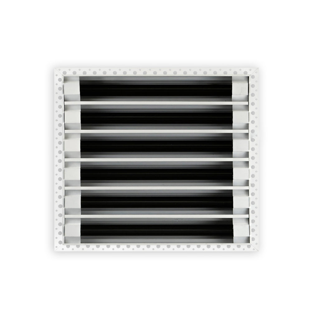 - Texas Buildmart offers Mud In Air Vent Covers also known as Drywall Mud-in White Air Vents. This Mud In Air Vent Cover shoots a 90-degree spread with option to adjust to one side or the other. These have decorative directional dampers. Modern, crisp, clean lines and architecturally appealing. Solid extruded aluminum profile, expertly welded, grinded, and sanded, with reinforcement brackets on the back and a uniform coat of electrostatic paint for a sleek, modern finish and easy maintenance. This white air vent register can be used as a supply air vent cover for ceilings and walls and as a return air vent cover register but looks like a Luxury Drywall Mud-in Vent Cover. If our Mud In Air Vent Cover is used as a Return air vent cover, please make sure the air vent cover is placed in the full open position or remove the directional dampers. Update your Ceiling and Wall Vents with our Mud In Air Vent Covers and it will update the entire look of your Home or Office Space. Rejillas para aire acondicionado de casa blanco. We make all sizes from 6x4 to 30x24 Modern Mud Air Vent Covers for the Modern Day Home. *This is a Design and Utility Patent Pending Product*