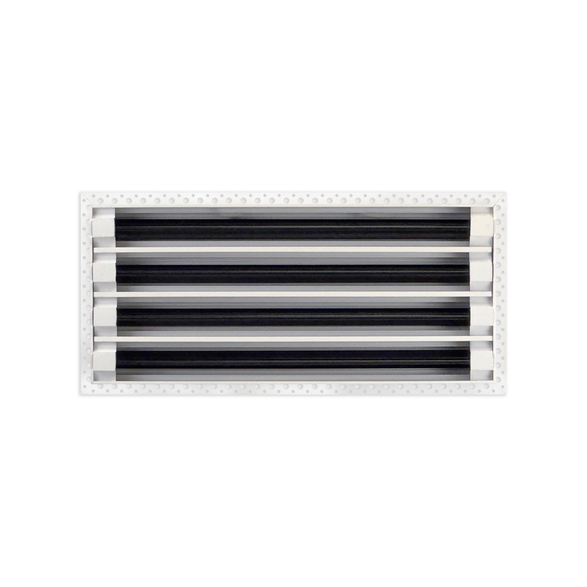 - Texas Buildmart offers Mud In Air Vent Covers also known as Drywall Mud-in White Air Vents. This Mud In Air Vent Cover shoots a 90-degree spread with option to adjust to one side or the other. These have decorative directional dampers. Modern, crisp, clean lines and architecturally appealing. Solid extruded aluminum profile, expertly welded, grinded, and sanded, with reinforcement brackets on the back and a uniform coat of electrostatic paint for a sleek, modern finish and easy maintenance. This white air vent register can be used as a supply air vent cover for ceilings and walls and as a return air vent cover register but looks like a Luxury Drywall Mud-in Vent Cover. If our Mud In Air Vent Cover is used as a Return air vent cover, please make sure the air vent cover is placed in the full open position or remove the directional dampers. Update your Ceiling and Wall Vents with our Mud In Air Vent Covers and it will update the entire look of your Home or Office Space. Rejillas para aire acondicionado de casa blanco. We make all sizes from 6x4 to 30x24 Modern Mud Air Vent Covers for the Modern Day Home. *This is a Design and Utility Patent Pending Product*